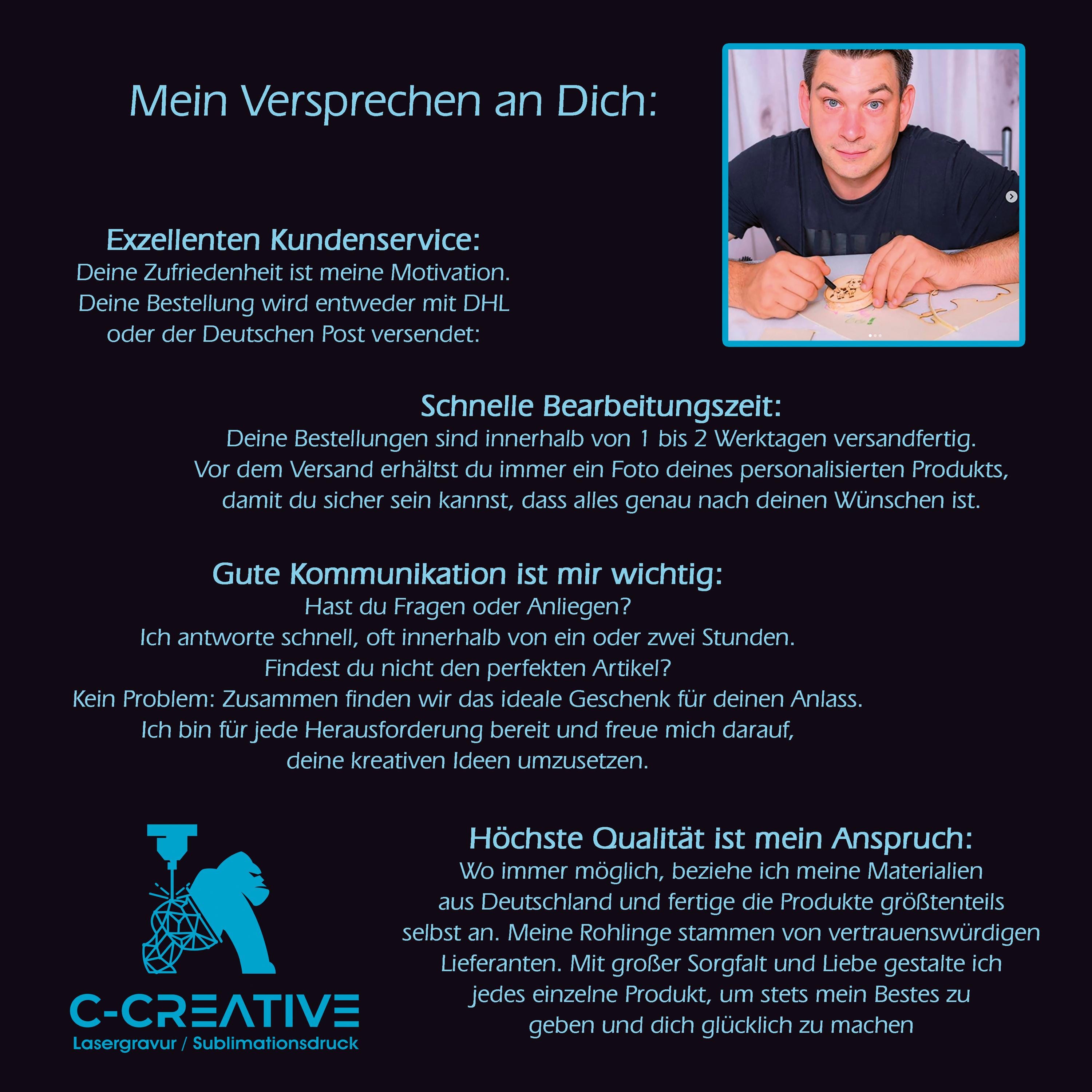 Sobald deine Bestellung fertig ist, senden wir dir immer ein Foto deines individuellen Produkts, damit du die Qualität und Präzision der Umsetzung nach deinen Vorstellungen überprüfen kannst. Falls etwas nicht deinen Erwartungen entsprechen sollte oder etwas defekt ankommt, stehen wir dir gerne zur Verfügung. Der defekte Artikel wird entweder erstattet und ersetzt.